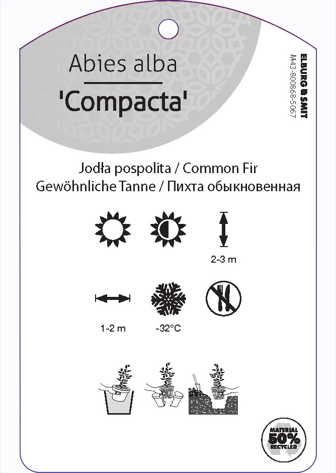 Etykieta zawieszana z dziurką w rozmiarze 75×119 mm. Wykonana z polipropylenu o grubości 0,5 mm w 50% pochodzącego z recyklingu. Etykieta odporna na działanie czynników atmosferycznych. Całość dodatkowo zabezpieczona jest lakierem UV zapobiegającym utracie kolorów.