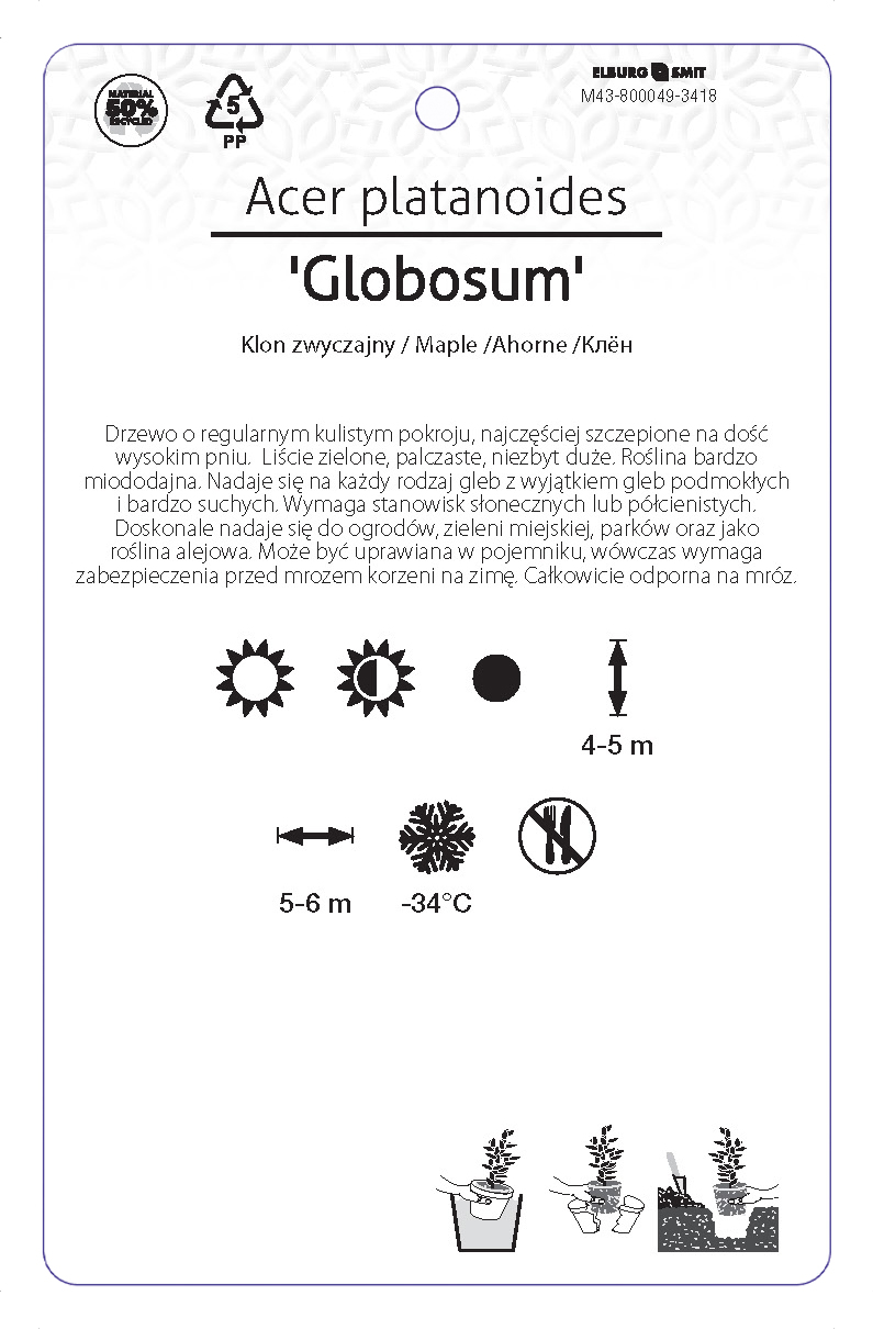 Etykieta zawieszana z gumką w rozmiarze 92×145 mm. Wykonana z polipropylenu o grubości 0,5 mm w 50% pochodzącego z recyklingu. Etykieta odporna na działanie czynników atmosferycznych. Całość dodatkowo zabezpieczona jest lakierem UV zapobiegającym utracie kolorów.
