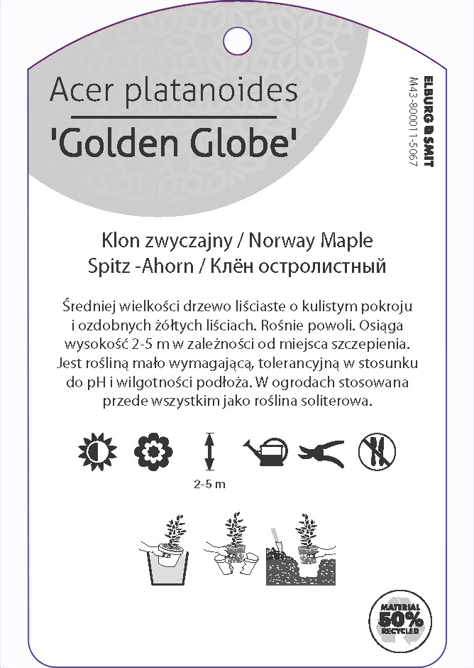 Etykieta zawieszana z gumką w rozmiarze 75×119 mm. Wykonana z polipropylenu o grubości 0,5 mm w 50% pochodzącego z recyklingu. Etykieta odporna na działanie czynników atmosferycznych. Całość dodatkowo zabezpieczona jest lakierem UV zapobiegającym utracie kolorów.