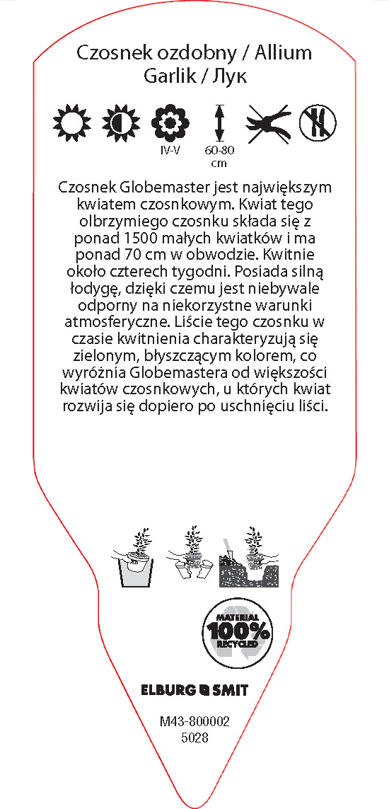 Etykieta wtykana w rozmiarze 58×145 mm. Wykonana z polistyrenu o grubości 0,6 mm w 100% pochodzącego z recyklingu. Etykieta odporna na działanie czynników atmosferycznych. Całość dodatkowo zabezpieczona jest lakierem UV zapobiegającym utracie kolorów.
