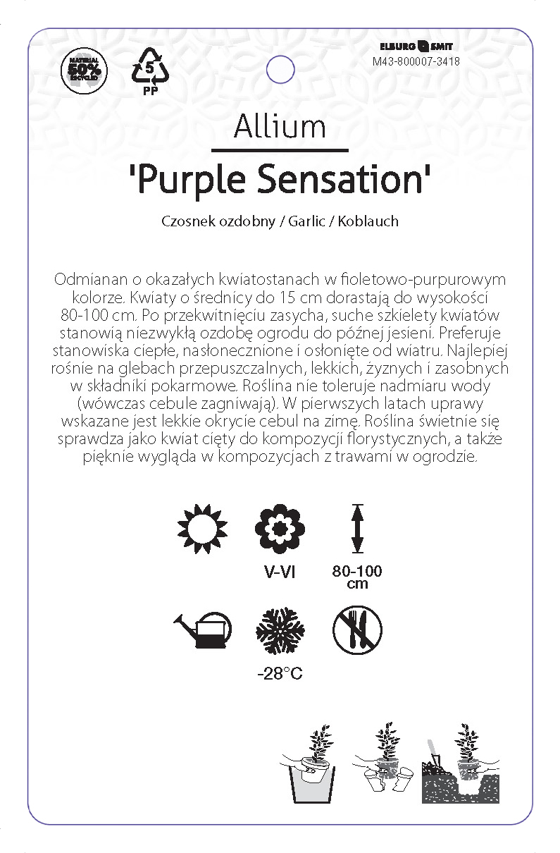 Etykieta zawieszana z gumką w rozmiarze 92×145 mm. Wykonana z polipropylenu o grubości 0,5 mm w 50% pochodzącego z recyklingu. Etykieta odporna na działanie czynników atmosferycznych. Całość dodatkowo zabezpieczona jest lakierem UV zapobiegającym utracie kolorów.