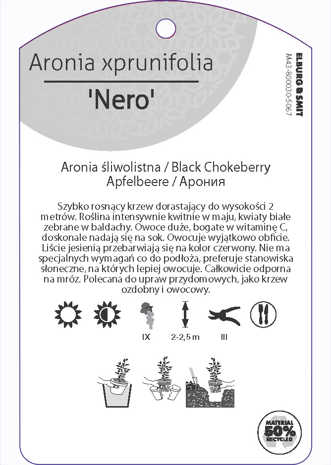 Etykieta zawieszana z gumką w rozmiarze 75×119 mm. Wykonana z polipropylenu o grubości 0,5 mm w 50% pochodzącego z recyklingu. Etykieta odporna na działanie czynników atmosferycznych. Całość dodatkowo zabezpieczona jest lakierem UV zapobiegającym utracie kolorów.