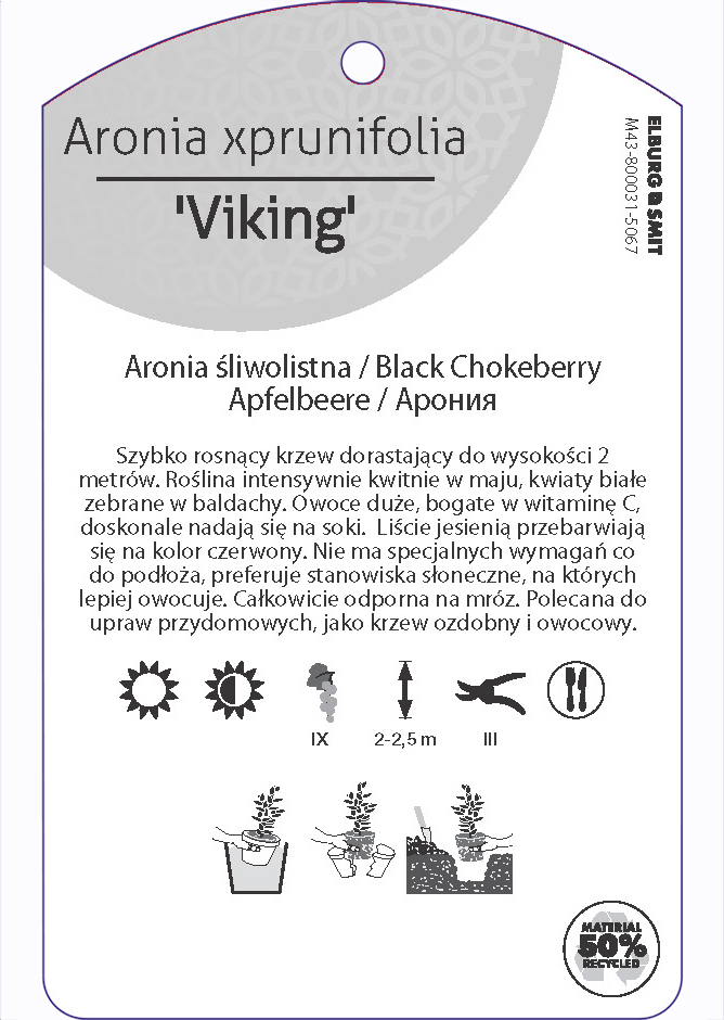 Etykieta zawieszana z gumką w rozmiarze 75×119 mm. Wykonana z polipropylenu o grubości 0,5 mm w 50% pochodzącego z recyklingu. Etykieta odporna na działanie czynników atmosferycznych. Całość dodatkowo zabezpieczona jest lakierem UV zapobiegającym utracie kolorów.