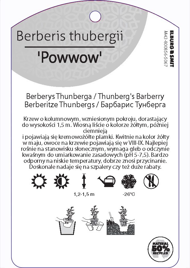 Etykieta zawieszana z dziurką w rozmiarze 75×119 mm. Wykonana z polipropylenu o grubości 0,5 mm w 50% pochodzącego z recyklingu. Etykieta odporna na działanie czynników atmosferycznych. Całość dodatkowo zabezpieczona jest lakierem UV zapobiegającym utracie kolorów.