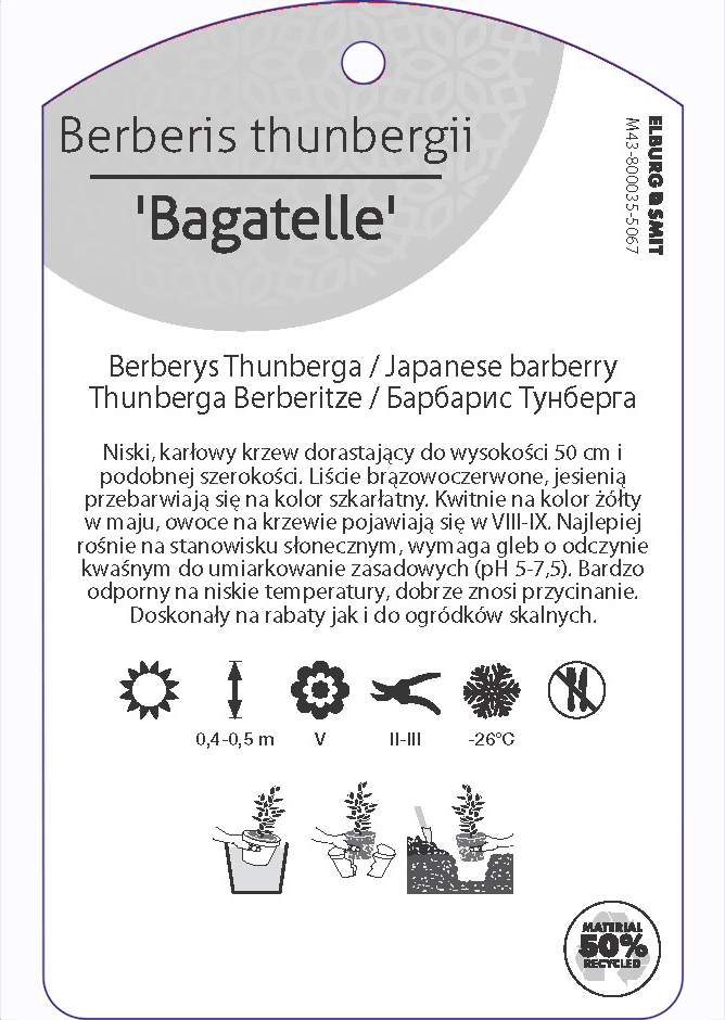 Etykieta zawieszana z gumką w rozmiarze 75×119 mm. Wykonana z polipropylenu o grubości 0,5 mm w 50% pochodzącego z recyklingu. Etykieta odporna na działanie czynników atmosferycznych. Całość dodatkowo zabezpieczona jest lakierem UV zapobiegającym utracie kolorów.