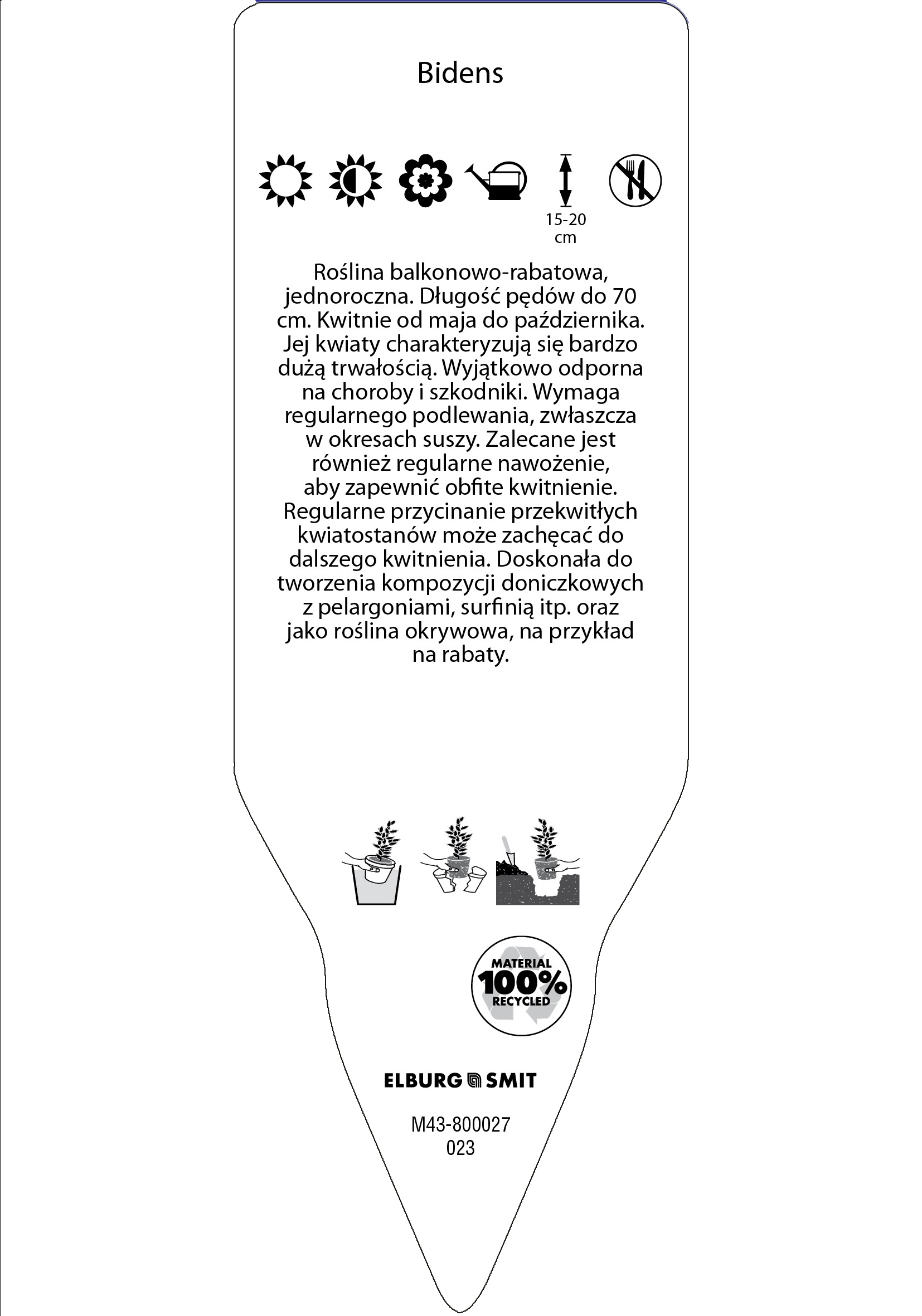 Etykieta wtykana w rozmiarze 35×100 mm. Wykonana z polistyrenu o grubości 0,6 mm w 100% pochodzącego z recyklingu. Etykieta odporna na działanie czynników atmosferycznych. Całość dodatkowo zabezpieczona jest lakierem UV zapobiegającym utracie kolorów.