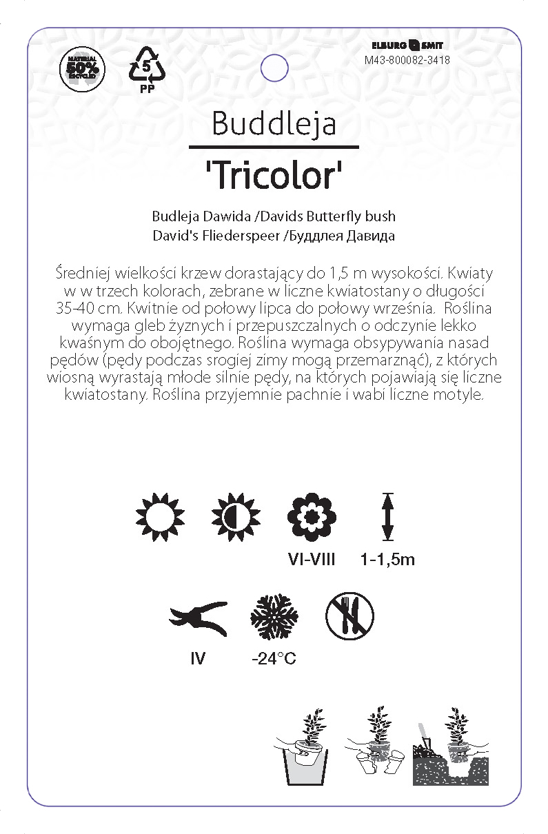 Etykieta zawieszana z gumką w rozmiarze 92×145 mm. Wykonana z polipropylenu o grubości 0,5 mm w 50% pochodzącego z recyklingu. Etykieta odporna na działanie czynników atmosferycznych. Całość dodatkowo zabezpieczona jest lakierem UV zapobiegającym utracie kolorów.