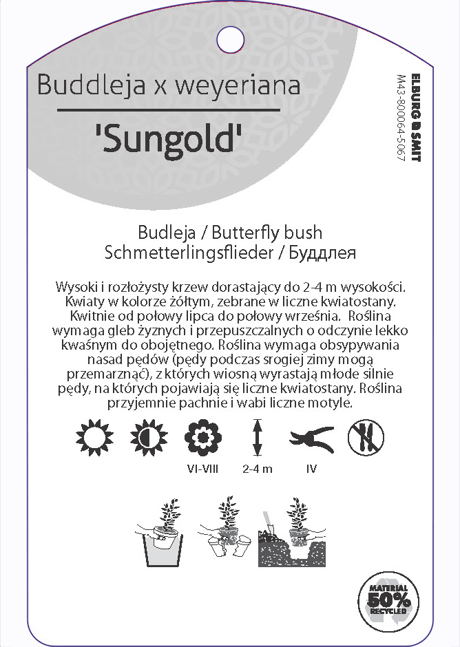 Etykieta zawieszana z gumką w rozmiarze 75×119 mm. Wykonana z polipropylenu o grubości 0,5 mm w 50% pochodzącego z recyklingu. Etykieta odporna na działanie czynników atmosferycznych. Całość dodatkowo zabezpieczona jest lakierem UV zapobiegającym utracie kolorów.