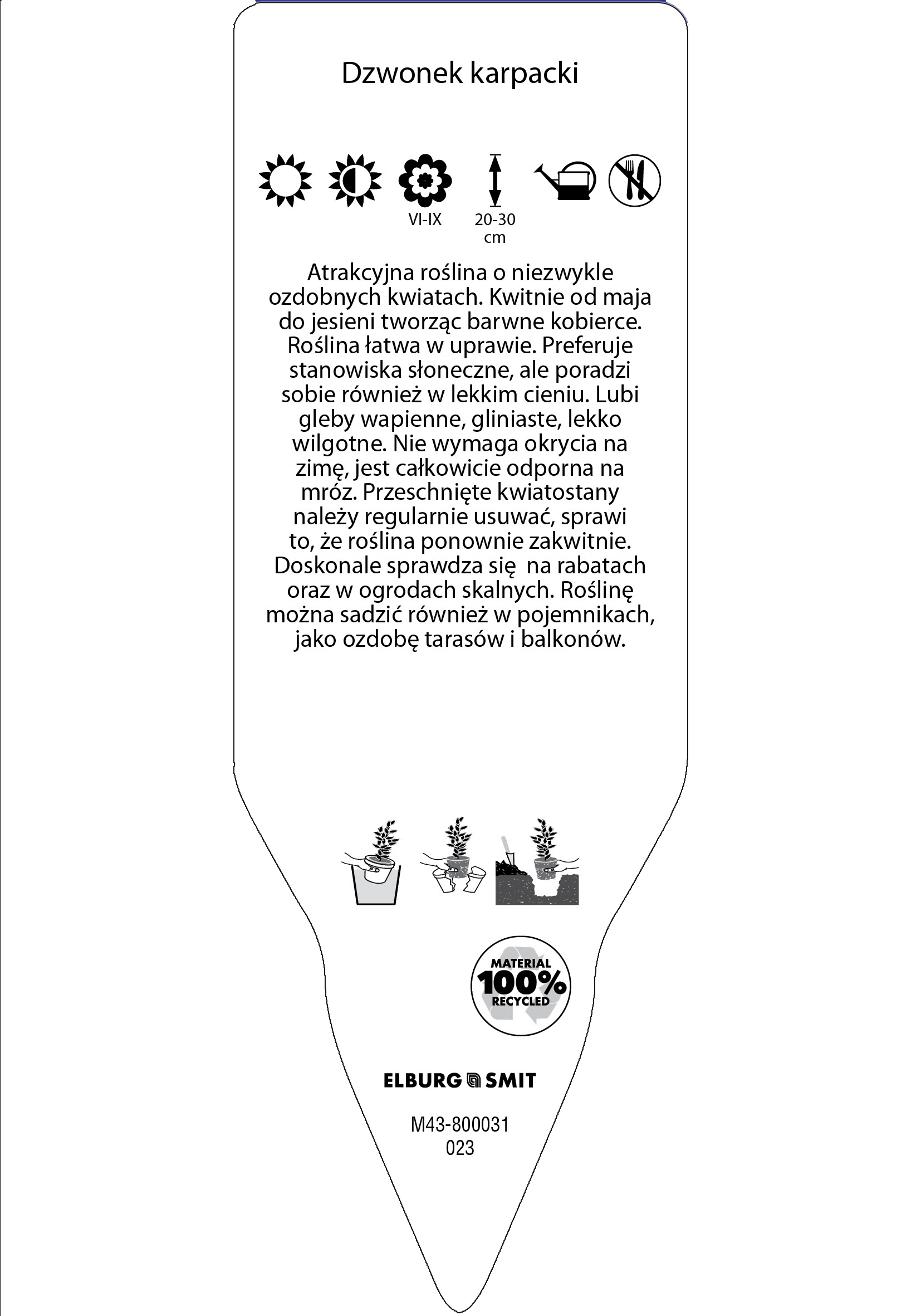 Etykieta wtykana w rozmiarze 35×100 mm. Wykonana z polistyrenu o grubości 0,6 mm w 100% pochodzącego z recyklingu. Etykieta odporna na działanie czynników atmosferycznych. Całość dodatkowo zabezpieczona jest lakierem UV zapobiegającym utracie kolorów.