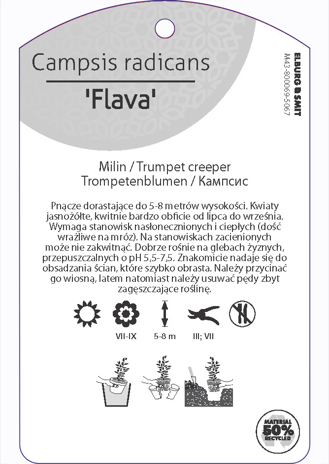 Etykieta zawieszana z gumką w rozmiarze 75×119 mm. Wykonana z polipropylenu o grubości 0,5 mm w 50% pochodzącego z recyklingu. Etykieta odporna na działanie czynników atmosferycznych. Całość dodatkowo zabezpieczona jest lakierem UV zapobiegającym utracie kolorów.