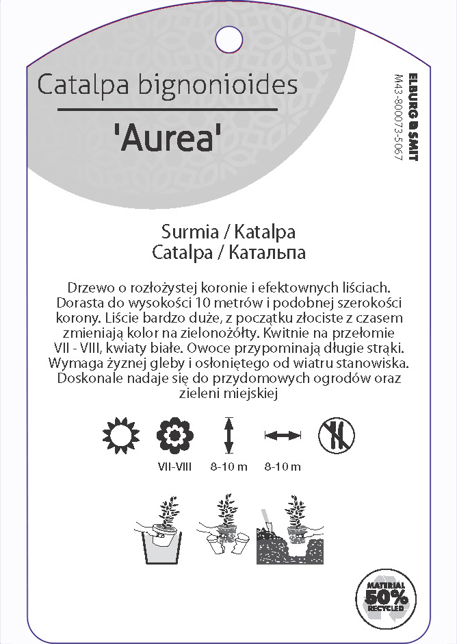 Etykieta zawieszana z gumką w rozmiarze 75×119 mm. Wykonana z polipropylenu o grubości 0,5 mm w 50% pochodzącego z recyklingu. Etykieta odporna na działanie czynników atmosferycznych. Całość dodatkowo zabezpieczona jest lakierem UV zapobiegającym utracie kolorów.