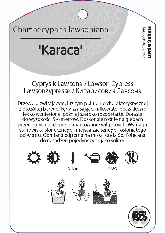 Etykieta zawieszana z gumką w rozmiarze 75×119 mm. Wykonana z polipropylenu o grubości 0,5 mm w 50% pochodzącego z recyklingu. Etykieta odporna na działanie czynników atmosferycznych. Całość dodatkowo zabezpieczona jest lakierem UV zapobiegającym utracie kolorów.