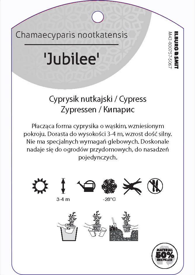 Etykieta zawieszana z gumką w rozmiarze 75×119 mm. Wykonana z polipropylenu o grubości 0,5 mm w 50% pochodzącego z recyklingu. Etykieta odporna na działanie czynników atmosferycznych. Całość dodatkowo zabezpieczona jest lakierem UV zapobiegającym utracie kolorów.