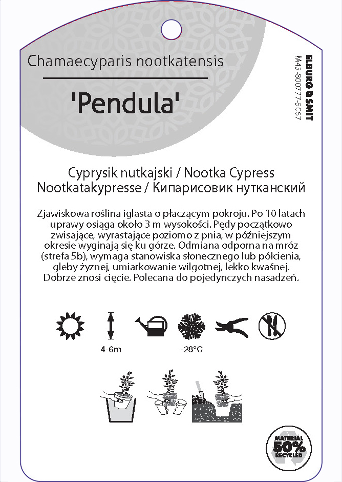 Etykieta zawieszana z gumką w rozmiarze 75×119 mm. Wykonana z polipropylenu o grubości 0,5 mm w 50% pochodzącego z recyklingu. Etykieta odporna na działanie czynników atmosferycznych. Całość dodatkowo zabezpieczona jest lakierem UV zapobiegającym utracie kolorów.