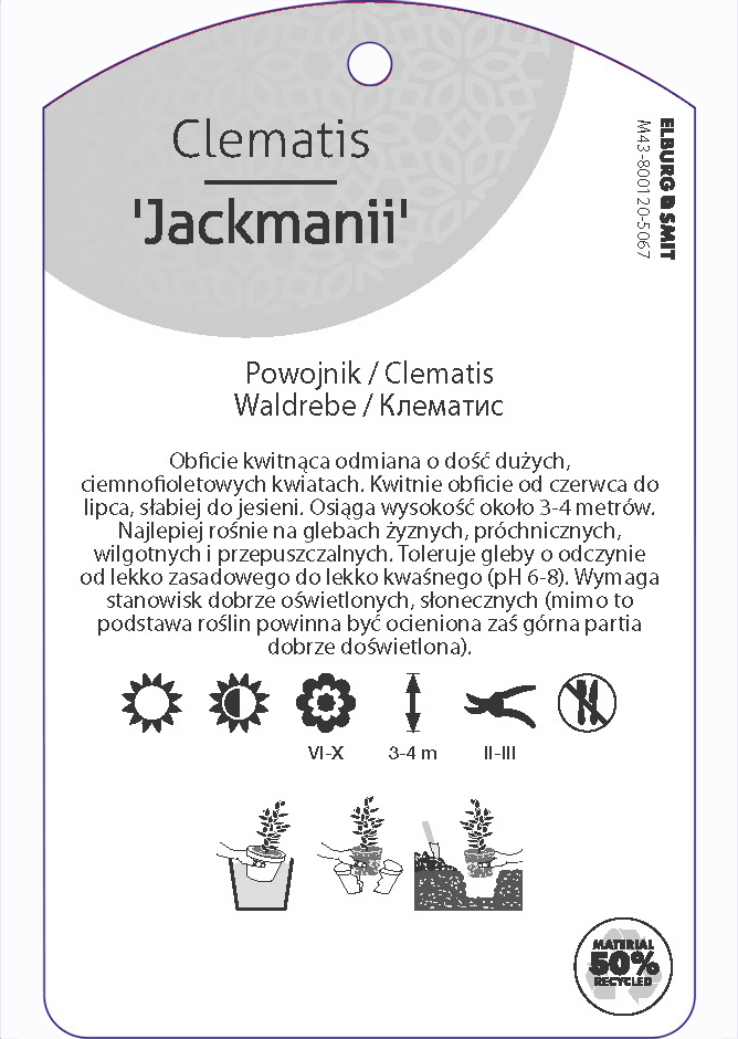 Etykieta zawieszana z gumką w rozmiarze 75×119 mm. Wykonana z polipropylenu o grubości 0,5 mm w 50% pochodzącego z recyklingu. Etykieta odporna na działanie czynników atmosferycznych. Całość dodatkowo zabezpieczona jest lakierem UV zapobiegającym utracie kolorów.