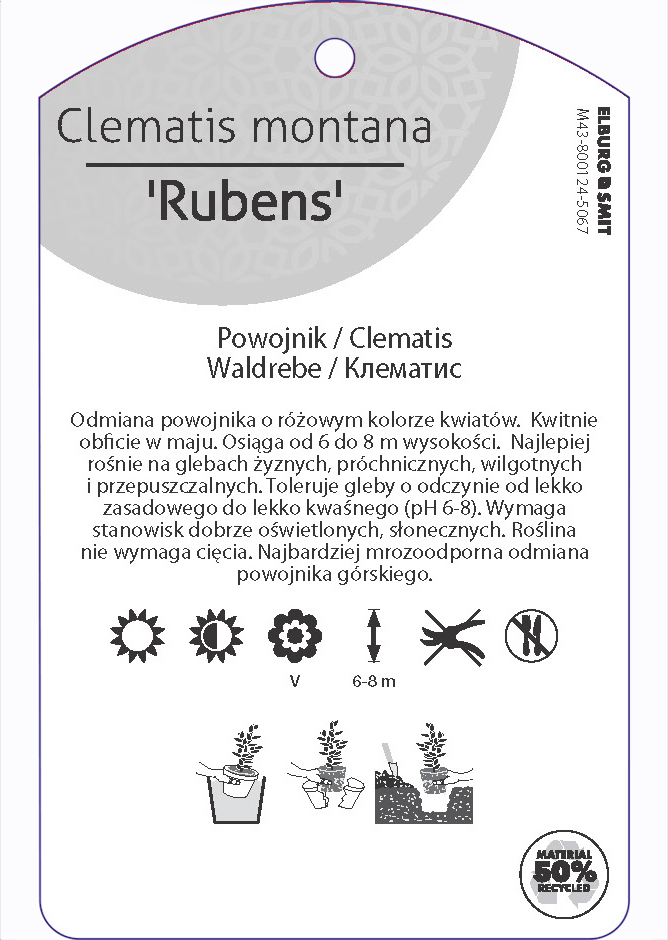 Etykieta zawieszana z gumką w rozmiarze 75×119 mm. Wykonana z polipropylenu o grubości 0,5 mm w 50% pochodzącego z recyklingu. Etykieta odporna na działanie czynników atmosferycznych. Całość dodatkowo zabezpieczona jest lakierem UV zapobiegającym utracie kolorów.