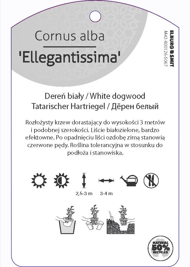 Etykieta zawieszana z gumką w rozmiarze 75×119 mm. Wykonana z polipropylenu o grubości 0,5 mm w 50% pochodzącego z recyklingu. Etykieta odporna na działanie czynników atmosferycznych. Całość dodatkowo zabezpieczona jest lakierem UV zapobiegającym utracie kolorów.