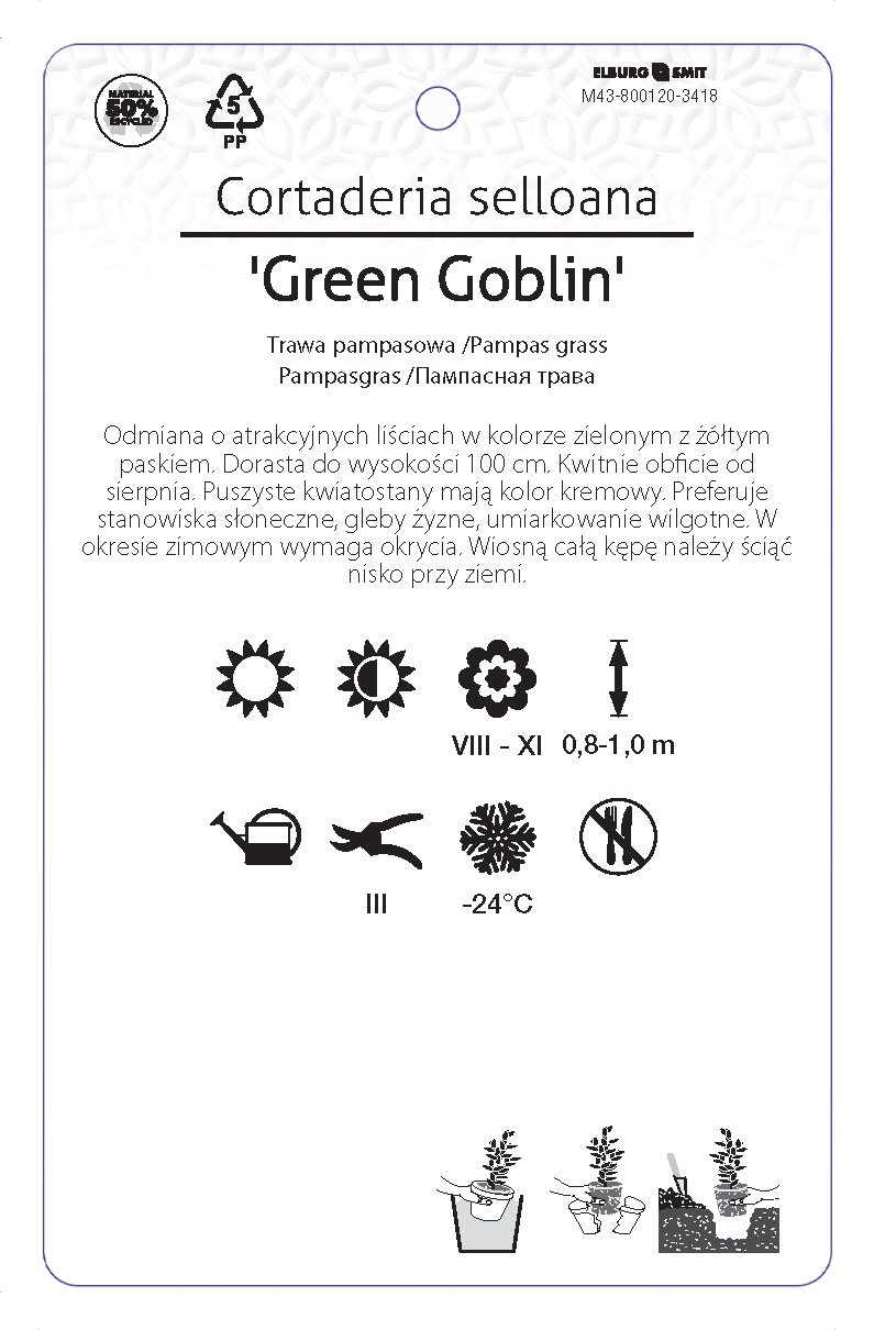 Etykieta zawieszana z gumką w rozmiarze 92×145 mm. Wykonana z polipropylenu o grubości 0,5 mm w 50% pochodzącego z recyklingu. Etykieta odporna na działanie czynników atmosferycznych. Całość dodatkowo zabezpieczona jest lakierem UV zapobiegającym utracie kolorów.