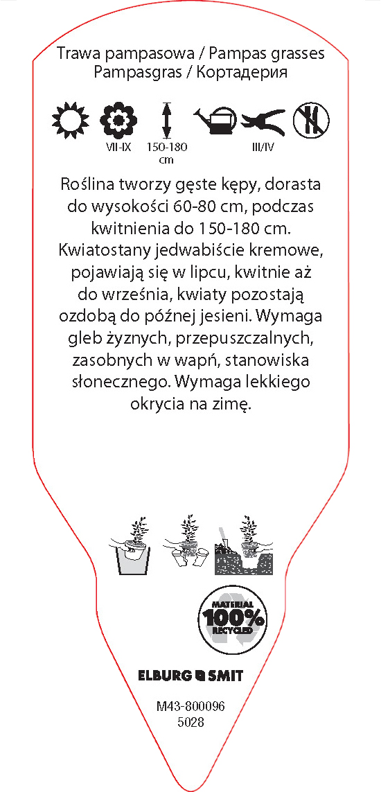 Etykieta wtykana w rozmiarze 58×145 mm. Wykonana z polistyrenu o grubości 0,6 mm w 100% pochodzącego z recyklingu. Etykieta odporna na działanie czynników atmosferycznych. Całość dodatkowo zabezpieczona jest lakierem UV zapobiegającym utracie kolorów.