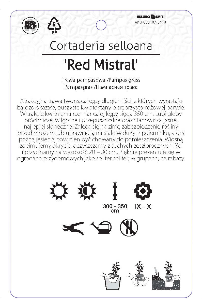 Etykieta zawieszana z gumką w rozmiarze 92×145 mm. Wykonana z polipropylenu o grubości 0,5 mm w 50% pochodzącego z recyklingu. Etykieta odporna na działanie czynników atmosferycznych. Całość dodatkowo zabezpieczona jest lakierem UV zapobiegającym utracie kolorów.