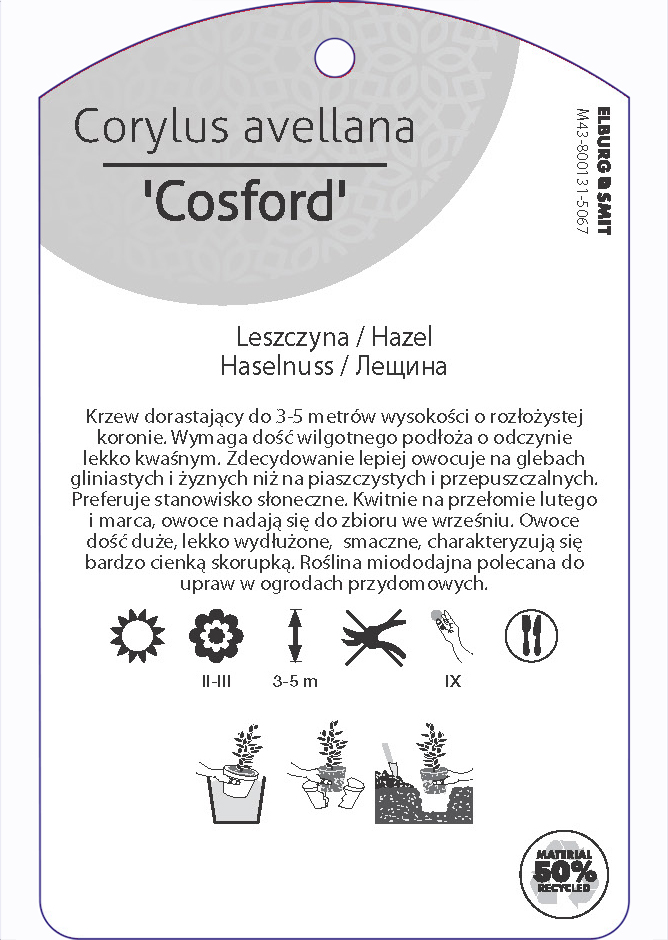 Etykieta zawieszana z gumką w rozmiarze 75×119 mm. Wykonana z polipropylenu o grubości 0,5 mm w 50% pochodzącego z recyklingu. Etykieta odporna na działanie czynników atmosferycznych. Całość dodatkowo zabezpieczona jest lakierem UV zapobiegającym utracie kolorów.