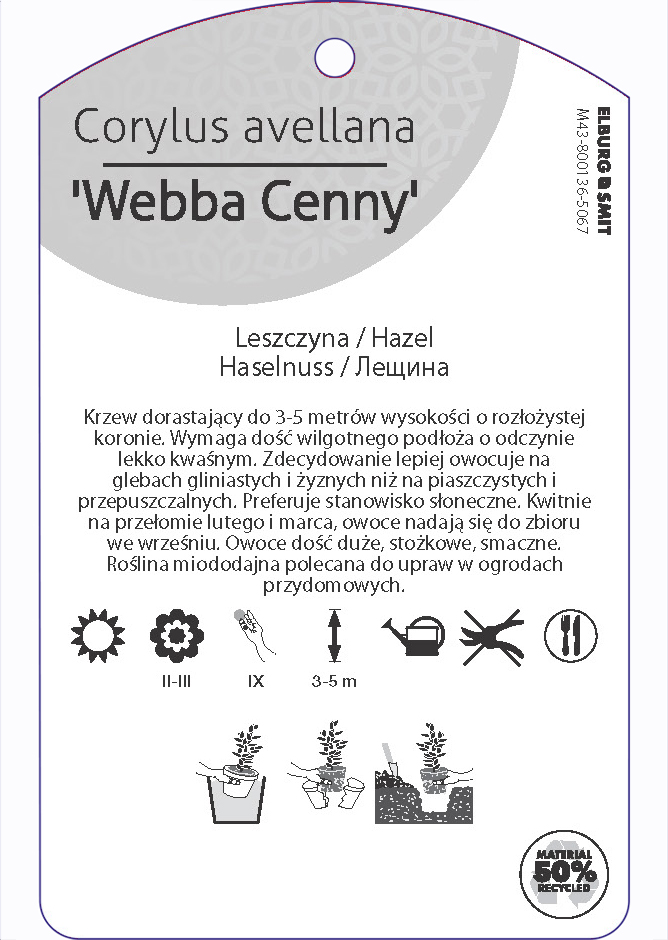 Etykieta zawieszana z gumką w rozmiarze 75×119 mm. Wykonana z polipropylenu o grubości 0,5 mm w 50% pochodzącego z recyklingu. Etykieta odporna na działanie czynników atmosferycznych. Całość dodatkowo zabezpieczona jest lakierem UV zapobiegającym utracie kolorów.