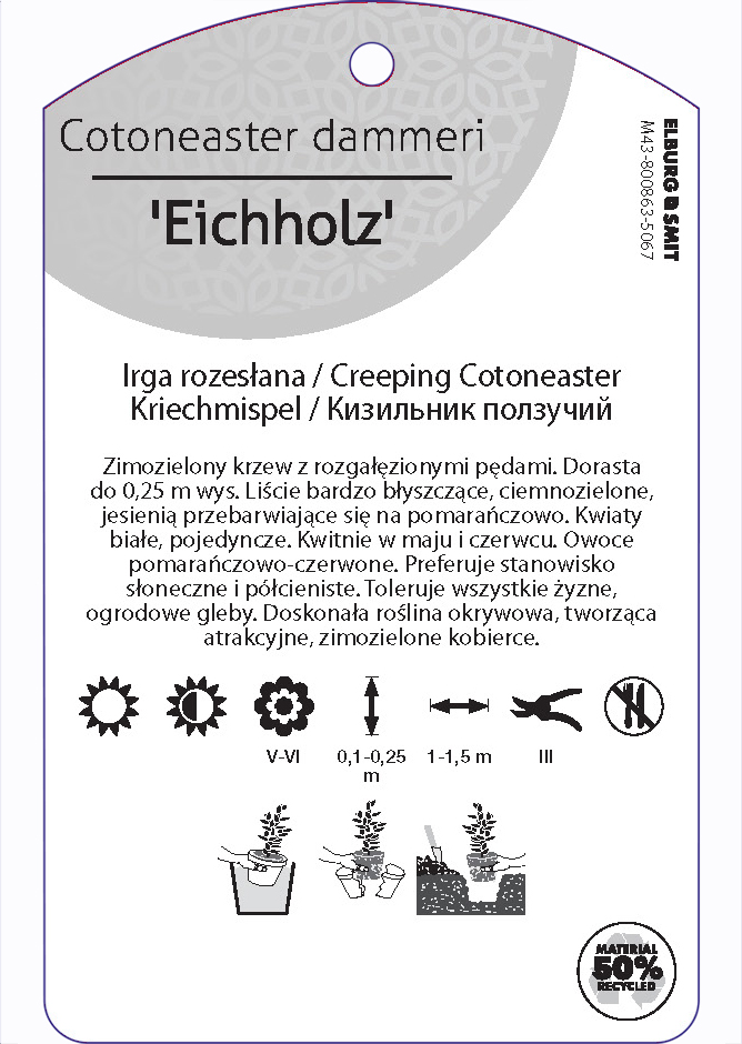 Etykieta zawieszana z gumką w rozmiarze 75×119 mm. Wykonana z polipropylenu o grubości 0,5 mm w 50% pochodzącego z recyklingu. Etykieta odporna na działanie czynników atmosferycznych. Całość dodatkowo zabezpieczona jest lakierem UV zapobiegającym utracie kolorów.
