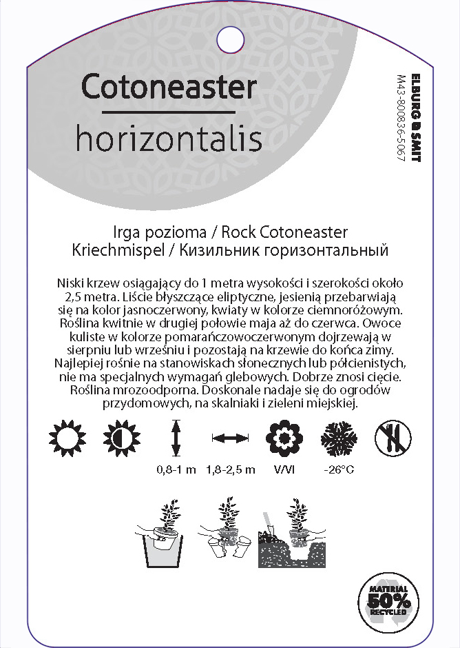 Etykieta zawieszana z gumką w rozmiarze 75×119 mm. Wykonana z polipropylenu o grubości 0,5 mm w 50% pochodzącego z recyklingu. Etykieta odporna na działanie czynników atmosferycznych. Całość dodatkowo zabezpieczona jest lakierem UV zapobiegającym utracie kolorów.