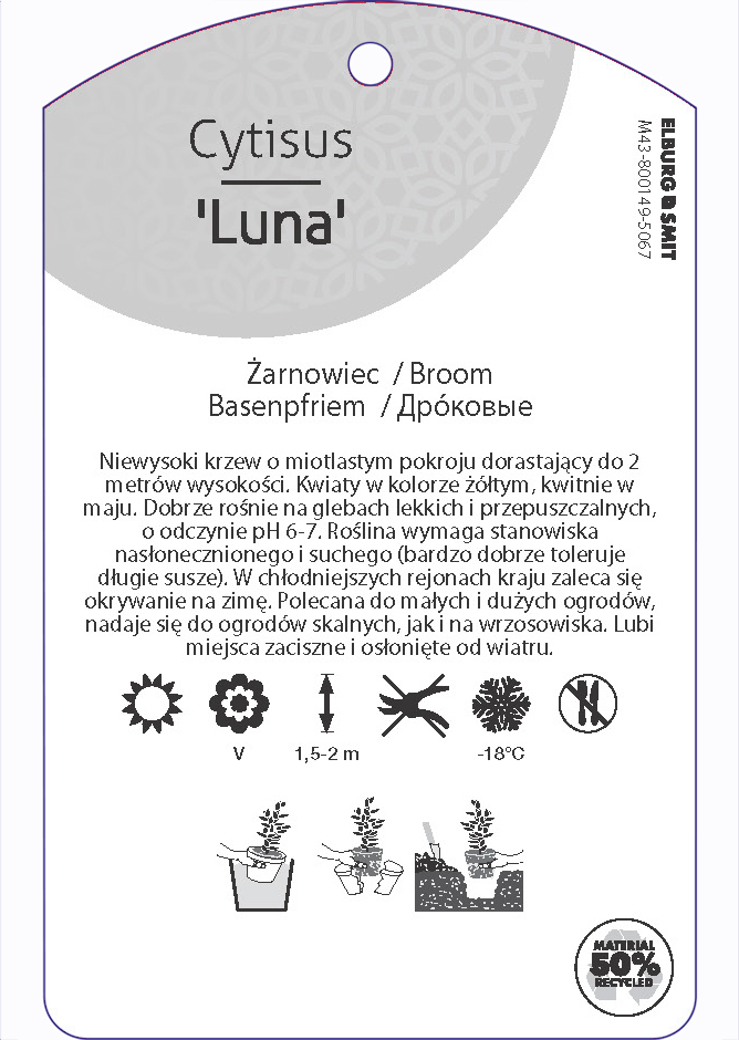 Etykieta zawieszana z gumką w rozmiarze 75×119 mm. Wykonana z polipropylenu o grubości 0,5 mm w 50% pochodzącego z recyklingu. Etykieta odporna na działanie czynników atmosferycznych. Całość dodatkowo zabezpieczona jest lakierem UV zapobiegającym utracie kolorów.