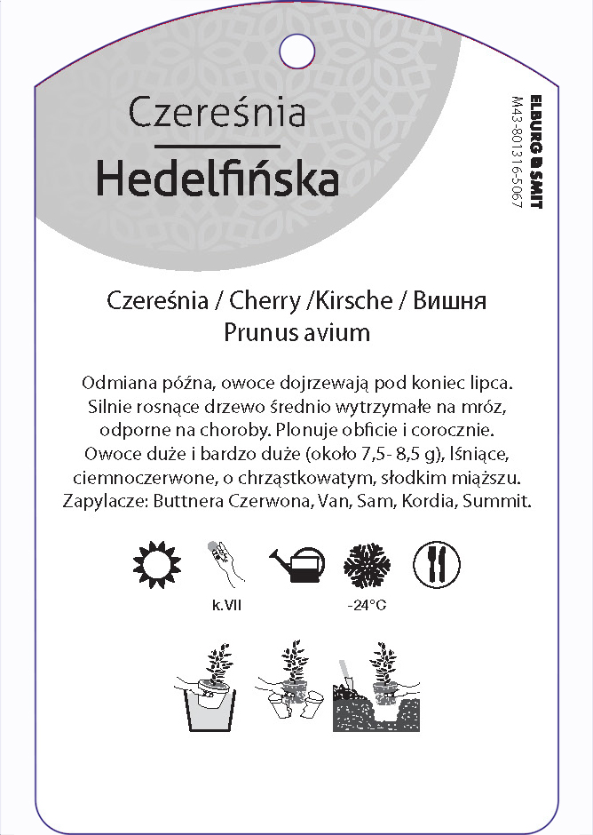 Etykieta zawieszana z gumką w rozmiarze 75×119 mm. Wykonana z polipropylenu o grubości 0,5 mm w 50% pochodzącego z recyklingu. Etykieta odporna na działanie czynników atmosferycznych. Całość dodatkowo zabezpieczona jest lakierem UV zapobiegającym utracie kolorów.