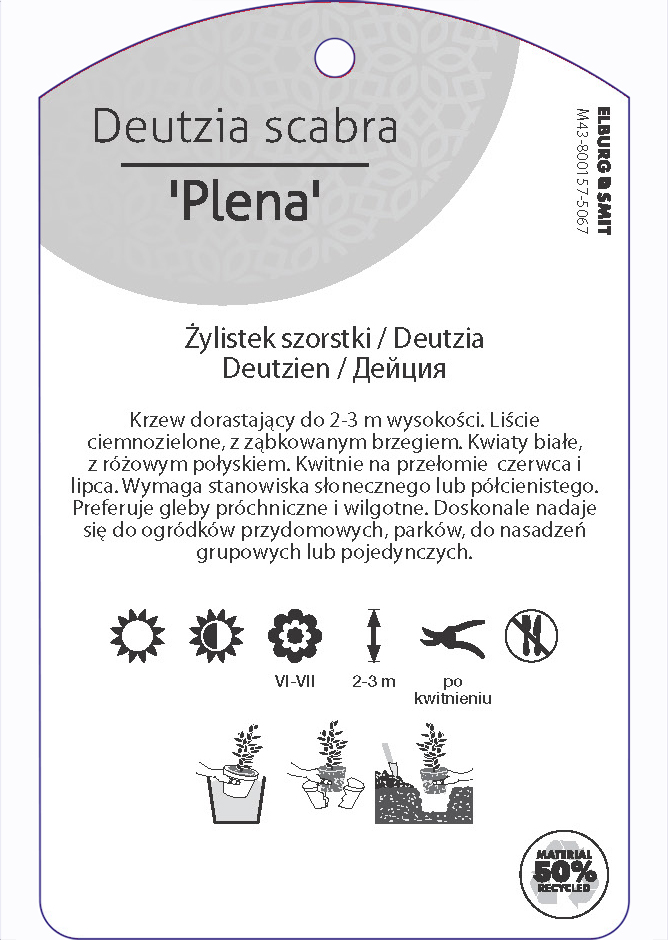 Etykieta zawieszana z gumką w rozmiarze 75×119 mm. Wykonana z polipropylenu o grubości 0,5 mm w 50% pochodzącego z recyklingu. Etykieta odporna na działanie czynników atmosferycznych. Całość dodatkowo zabezpieczona jest lakierem UV zapobiegającym utracie kolorów.