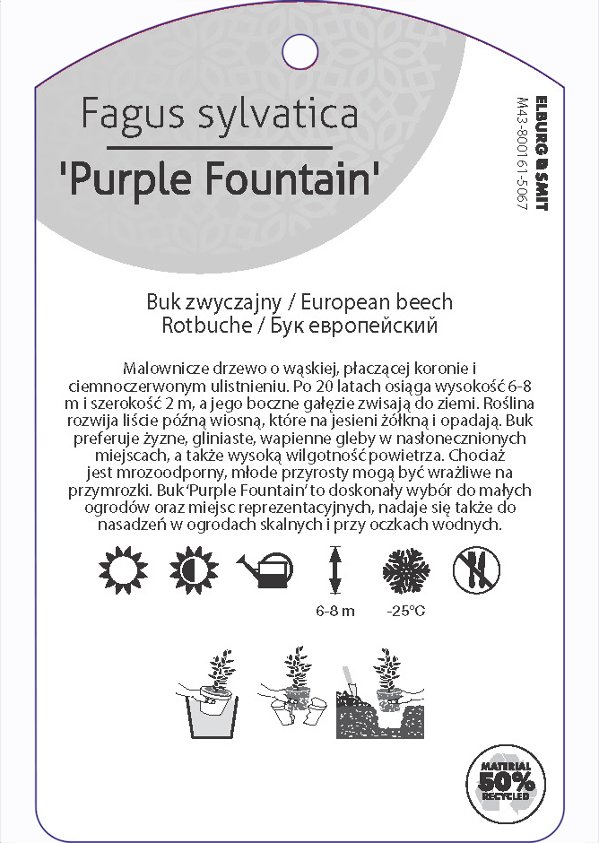 Etykieta zawieszana z gumką w rozmiarze 75×119 mm. Wykonana z polipropylenu o grubości 0,5 mm w 50% pochodzącego z recyklingu. Etykieta odporna na działanie czynników atmosferycznych. Całość dodatkowo zabezpieczona jest lakierem UV zapobiegającym utracie kolorów.