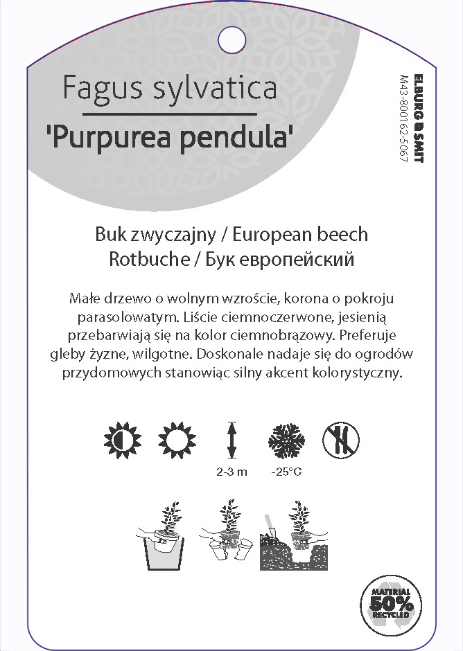 Etykieta zawieszana z gumką w rozmiarze 75×119 mm. Wykonana z polipropylenu o grubości 0,5 mm w 50% pochodzącego z recyklingu. Etykieta odporna na działanie czynników atmosferycznych. Całość dodatkowo zabezpieczona jest lakierem UV zapobiegającym utracie kolorów.