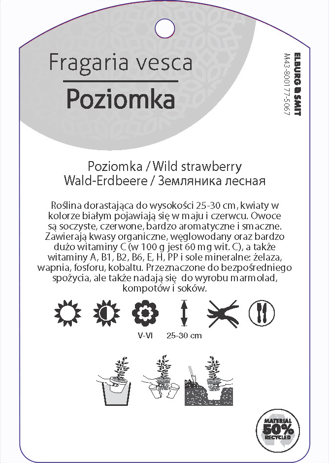 Etykieta zawieszana z dziurką w rozmiarze 75×119 mm. Wykonana z polipropylenu o grubości 0,5 mm w 50% pochodzącego z recyklingu. Etykieta odporna na działanie czynników atmosferycznych. Całość dodatkowo zabezpieczona jest lakierem UV zapobiegającym utracie kolorów.