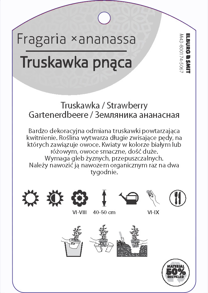 Etykieta zawieszana z dziurką w rozmiarze 75×119 mm. Wykonana z polipropylenu o grubości 0,5 mm w 50% pochodzącego z recyklingu. Etykieta odporna na działanie czynników atmosferycznych. Całość dodatkowo zabezpieczona jest lakierem UV zapobiegającym utracie kolorów.