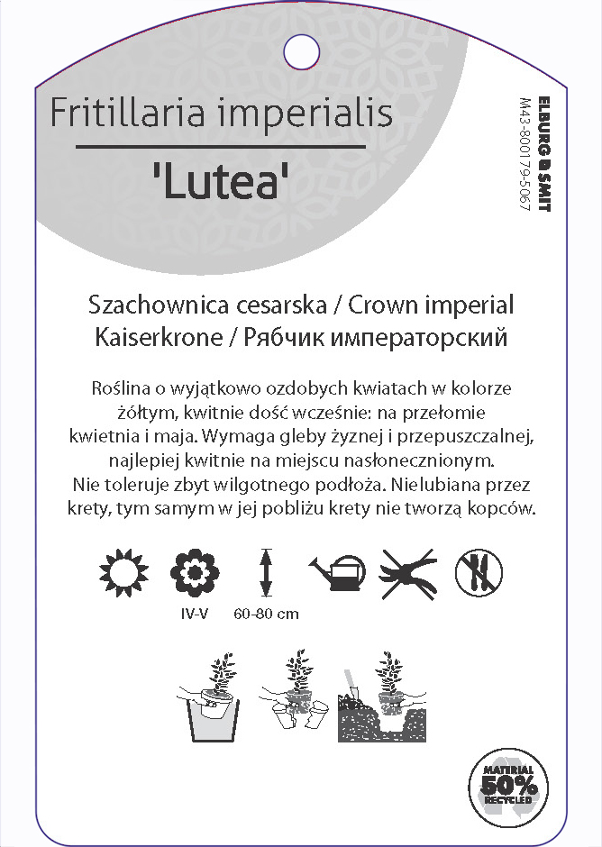 Etykieta zawieszana z dziurką w rozmiarze 75×119 mm. Wykonana z polipropylenu o grubości 0,5 mm w 50% pochodzącego z recyklingu. Etykieta odporna na działanie czynników atmosferycznych. Całość dodatkowo zabezpieczona jest lakierem UV zapobiegającym utracie kolorów.