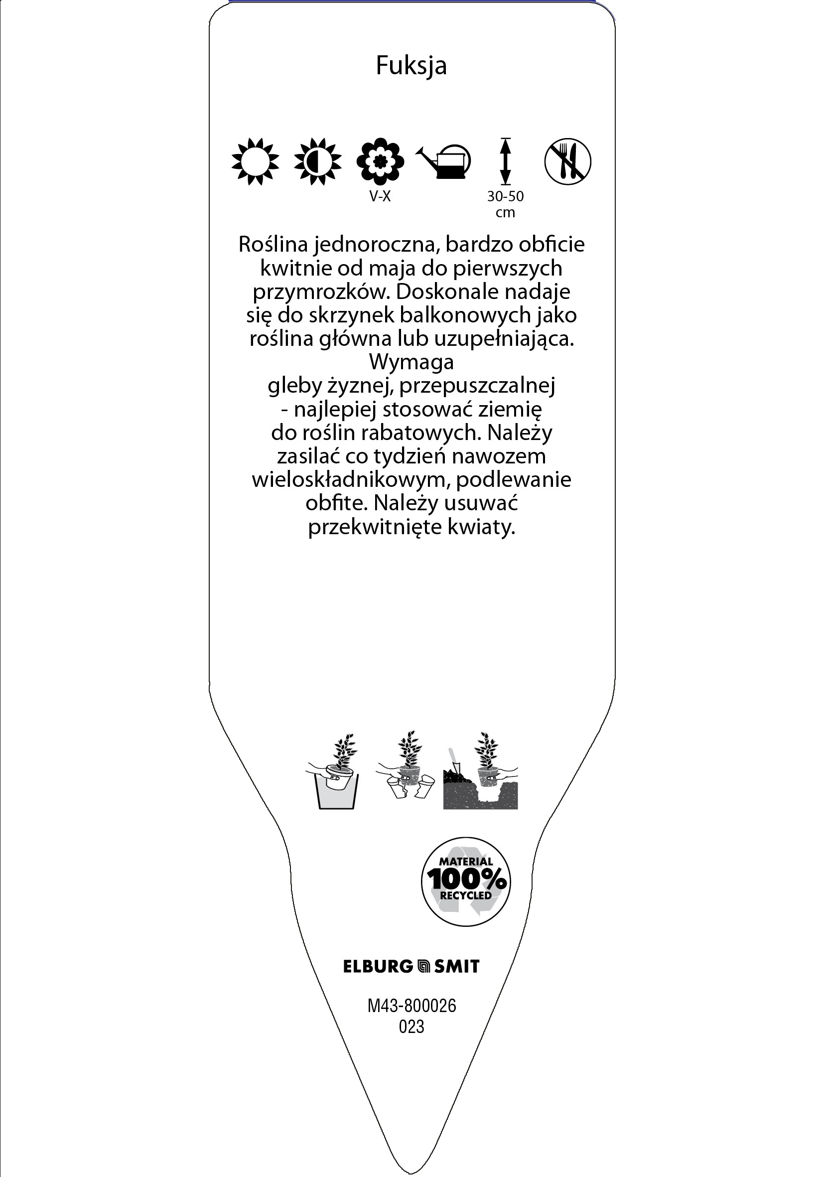 Etykieta wtykana w rozmiarze 35×100 mm. Wykonana z polistyrenu o grubości 0,6 mm w 100% pochodzącego z recyklingu. Etykieta odporna na działanie czynników atmosferycznych. Całość dodatkowo zabezpieczona jest lakierem UV zapobiegającym utracie kolorów.