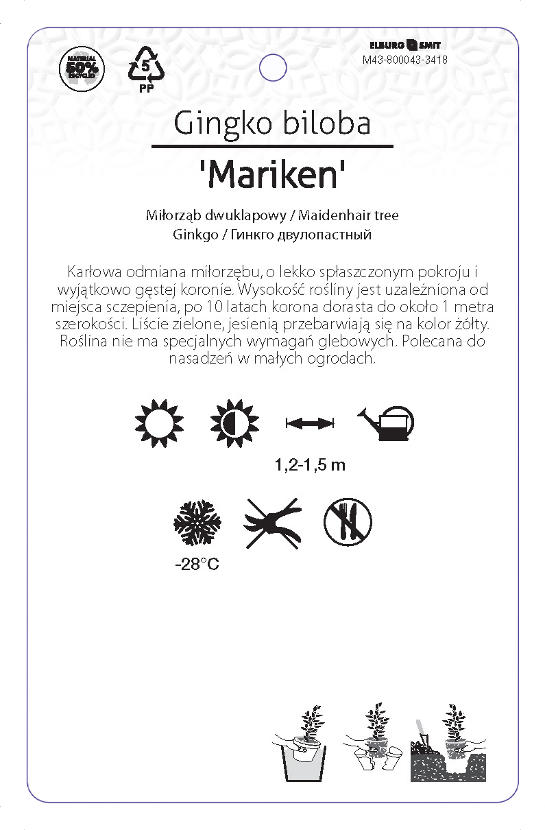 Etykieta zawieszana z gumką w rozmiarze 92×145 mm. Wykonana z polipropylenu o grubości 0,5 mm w 50% pochodzącego z recyklingu. Etykieta odporna na działanie czynników atmosferycznych. Całość dodatkowo zabezpieczona jest lakierem UV zapobiegającym utracie kolorów.