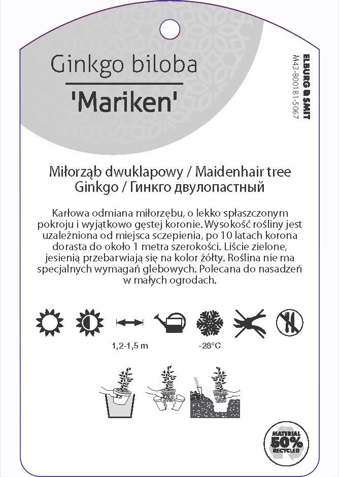 Etykieta zawieszana z gumką w rozmiarze 75×119 mm. Wykonana z polipropylenu o grubości 0,5 mm w 50% pochodzącego z recyklingu. Etykieta odporna na działanie czynników atmosferycznych. Całość dodatkowo zabezpieczona jest lakierem UV zapobiegającym utracie kolorów.