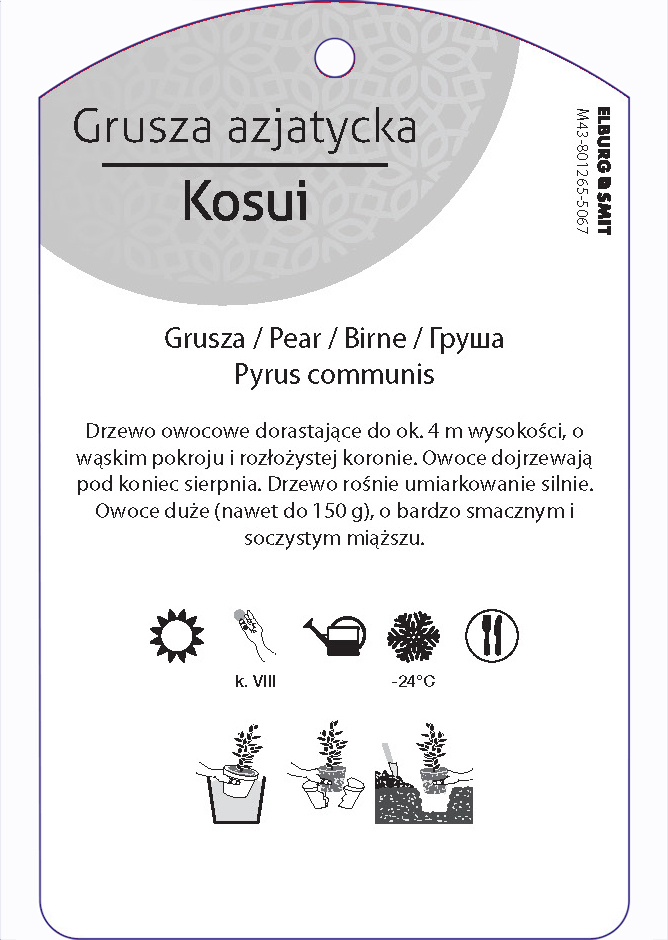 Etykieta zawieszana z gumką w rozmiarze 75×119 mm. Wykonana z polipropylenu o grubości 0,5 mm w 50% pochodzącego z recyklingu. Etykieta odporna na działanie czynników atmosferycznych. Całość dodatkowo zabezpieczona jest lakierem UV zapobiegającym utracie kolorów.