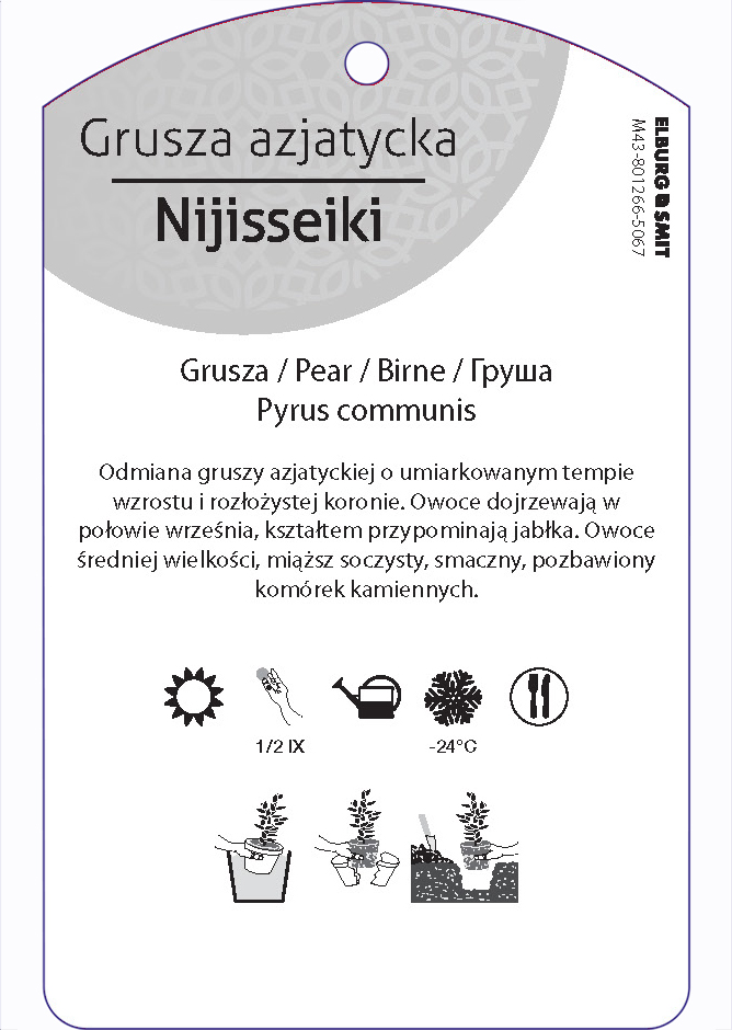 Etykieta zawieszana z gumką w rozmiarze 75×119 mm. Wykonana z polipropylenu o grubości 0,5 mm w 50% pochodzącego z recyklingu. Etykieta odporna na działanie czynników atmosferycznych. Całość dodatkowo zabezpieczona jest lakierem UV zapobiegającym utracie kolorów.