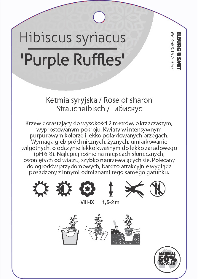 Etykieta zawieszana z gumką w rozmiarze 75×119 mm. Wykonana z polipropylenu o grubości 0,5 mm w 50% pochodzącego z recyklingu. Etykieta odporna na działanie czynników atmosferycznych. Całość dodatkowo zabezpieczona jest lakierem UV zapobiegającym utracie kolorów.