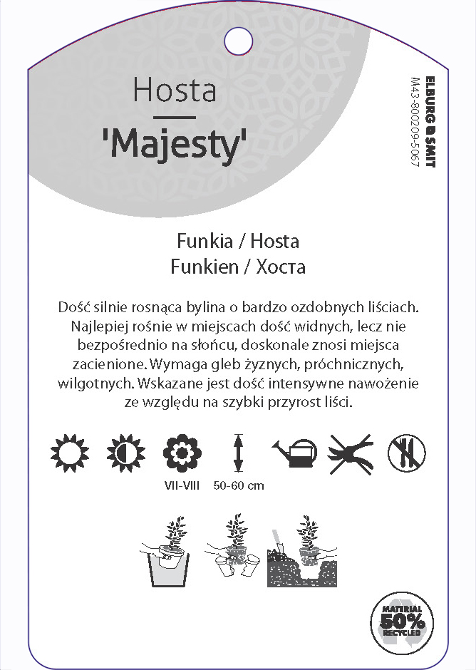 Etykieta zawieszana z dziurką w rozmiarze 75×119 mm. Wykonana z polipropylenu o grubości 0,5 mm w 50% pochodzącego z recyklingu. Etykieta odporna na działanie czynników atmosferycznych. Całość dodatkowo zabezpieczona jest lakierem UV zapobiegającym utracie kolorów.