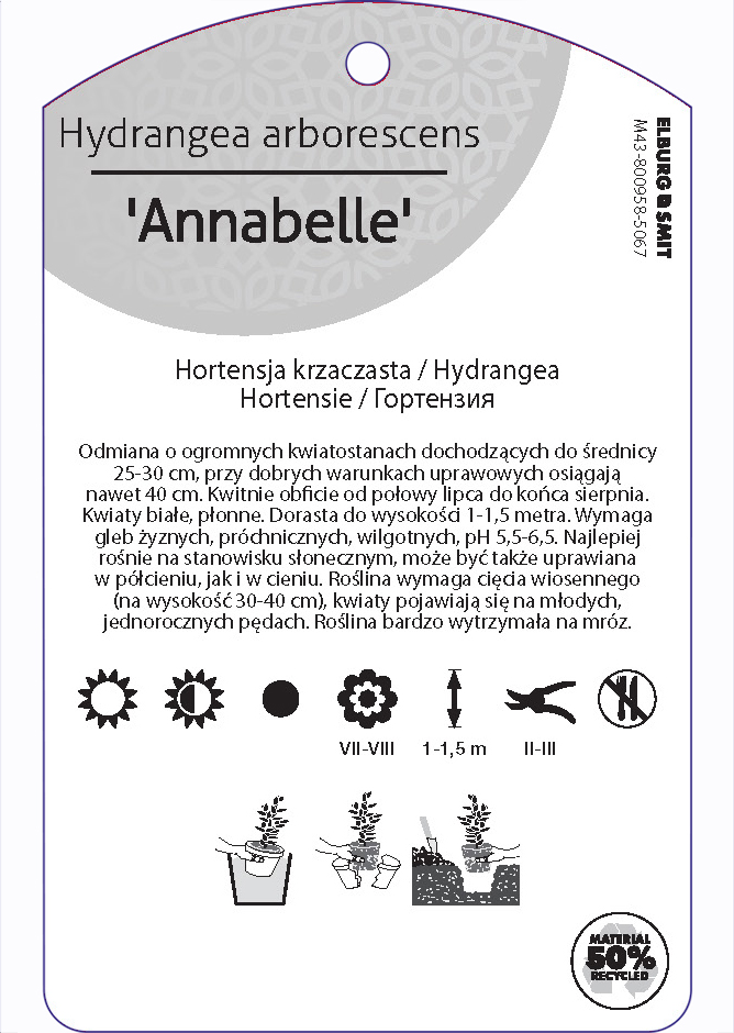 Etykieta zawieszana z gumką w rozmiarze 75×119 mm. Wykonana z polipropylenu o grubości 0,5 mm w 50% pochodzącego z recyklingu. Etykieta odporna na działanie czynników atmosferycznych. Całość dodatkowo zabezpieczona jest lakierem UV zapobiegającym utracie kolorów.