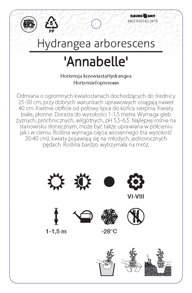 Etykieta zawieszana z gumką w rozmiarze 92×145 mm. Wykonana z polipropylenu o grubości 0,5 mm w 50% pochodzącego z recyklingu. Etykieta odporna na działanie czynników atmosferycznych. Całość dodatkowo zabezpieczona jest lakierem UV zapobiegającym utracie kolorów.