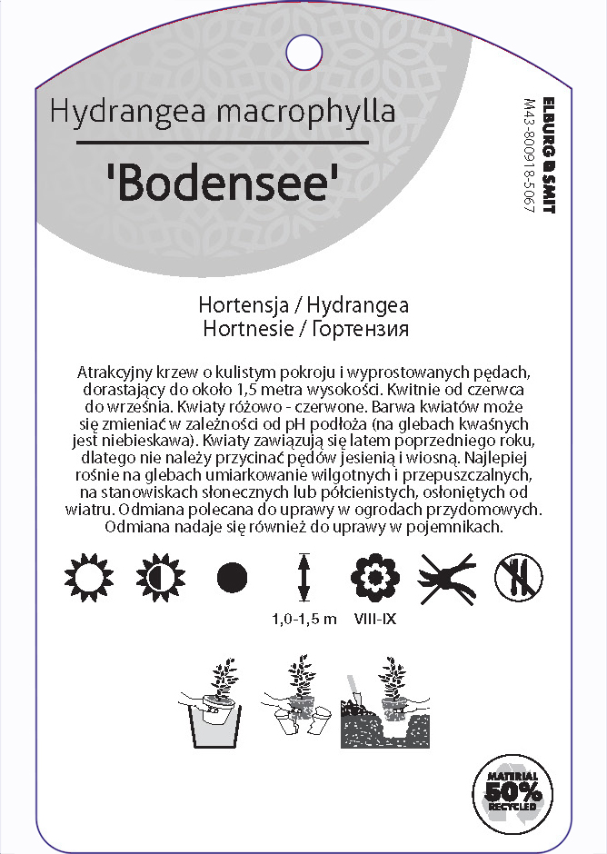 Etykieta zawieszana z gumką w rozmiarze 75×119 mm. Wykonana z polipropylenu o grubości 0,5 mm w 50% pochodzącego z recyklingu. Etykieta odporna na działanie czynników atmosferycznych. Całość dodatkowo zabezpieczona jest lakierem UV zapobiegającym utracie kolorów.