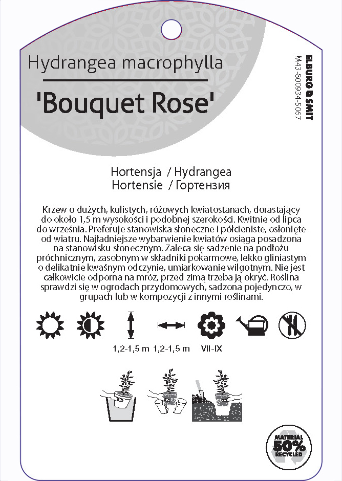 Etykieta zawieszana z gumką w rozmiarze 75×119 mm. Wykonana z polipropylenu o grubości 0,5 mm w 50% pochodzącego z recyklingu. Etykieta odporna na działanie czynników atmosferycznych. Całość dodatkowo zabezpieczona jest lakierem UV zapobiegającym utracie kolorów.