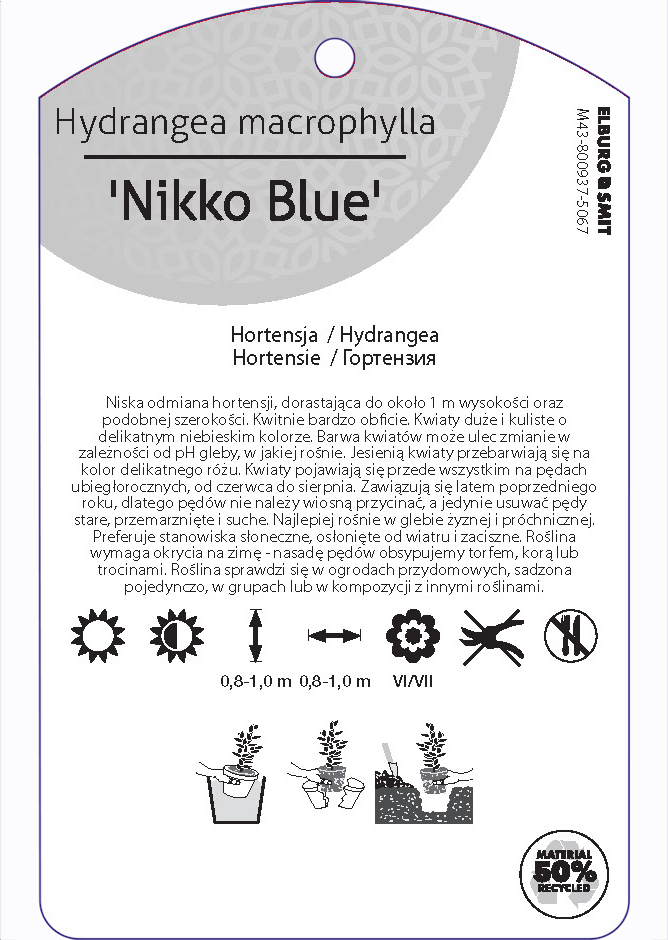 Etykieta zawieszana z gumką w rozmiarze 75×119 mm. Wykonana z polipropylenu o grubości 0,5 mm w 50% pochodzącego z recyklingu. Etykieta odporna na działanie czynników atmosferycznych. Całość dodatkowo zabezpieczona jest lakierem UV zapobiegającym utracie kolorów.