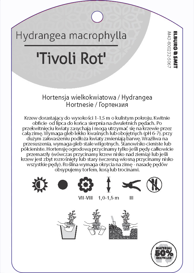 Etykieta zawieszana z gumką w rozmiarze 75×119 mm. Wykonana z polipropylenu o grubości 0,5 mm w 50% pochodzącego z recyklingu. Etykieta odporna na działanie czynników atmosferycznych. Całość dodatkowo zabezpieczona jest lakierem UV zapobiegającym utracie kolorów.