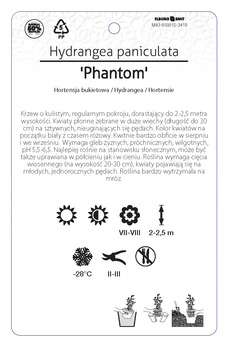 Etykieta zawieszana z gumką w rozmiarze 92×145 mm. Wykonana z polipropylenu o grubości 0,5 mm w 50% pochodzącego z recyklingu. Etykieta odporna na działanie czynników atmosferycznych. Całość dodatkowo zabezpieczona jest lakierem UV zapobiegającym utracie kolorów.